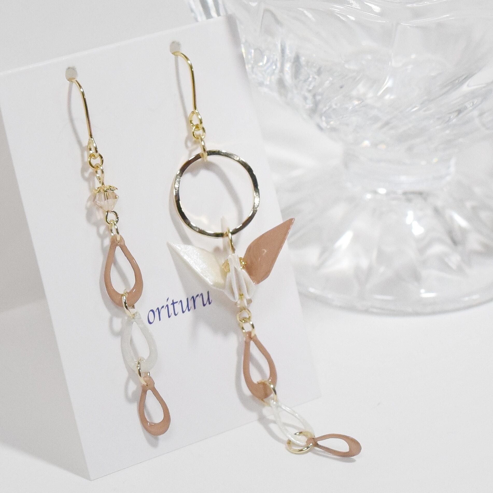 ホワイトパールとベージュのバイカラーペインティング鶴とメタルフープパーツ、オリジナルフープパーツと組み合わせたロングサイズのピアスです。